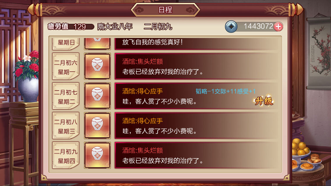 在熟悉游戏的一些基本操作后,玩家就需要开始进行学习或者打工的日程安排。玩家可以通过在指定商业场所工作,从而获得银币奖励和对应的技能属性增幅,但同时也会根据工作量和工作种类的不同增加自己的疲劳值和一些负面属性值。