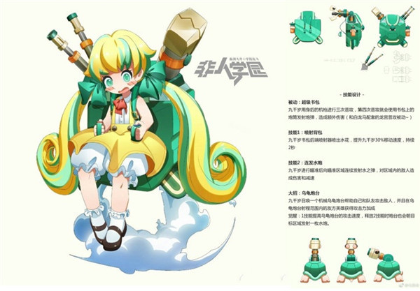 九千岁则是萌妹化的龟丞相,画工精致,有着饱满的形象刻画、性格设计与背景故事,完美融入了非人的世界观,武器与攻击模式、技能设计也都相互呼应,可以说是专业级别的作品啦!