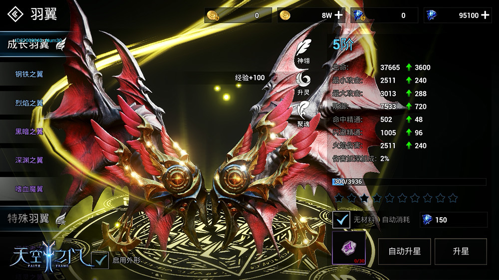 在《天空之门》中,不同羽翼对角色的属性加成也不相同,而在玩家冒险之旅,羽翼几乎是与玩家终身相伴的重要道具,对玩家的战力也起到至关重要的影响。培养羽翼的过程中,玩家可以对羽翼进行升星,而当前阶级满星后便可以升阶。无论是升星还是升阶,羽翼的属性都将不断成长,而升阶后的羽翼更是会发生翻天覆地的变化,让玩家战力直线飙升。有了这样的羽翼为伴,各位勇士自然可以上天入地,在这个魔幻世界尽情驰骋啦!