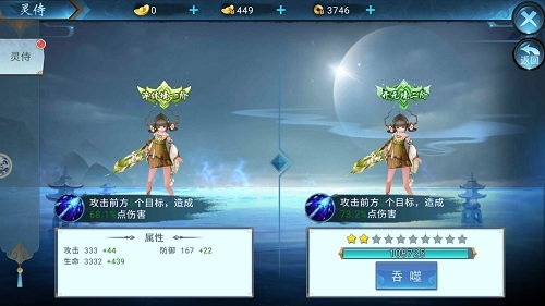 灵侍养成分为三个部分,分别为:等阶、装备、技能。灵侍主要增加攻击、防御、生命三种属性。使用灵侍资质丹和灵侍成长丹可以增加灵侍的属性。灵侍资质丹和灵侍成长丹可以通过进阶路、五色塔、历练商店中获得。灵侍还可通过吞噬装备获取经验值,提升等级,增加属性,吞噬的装备品质越好,增加的经验越多。