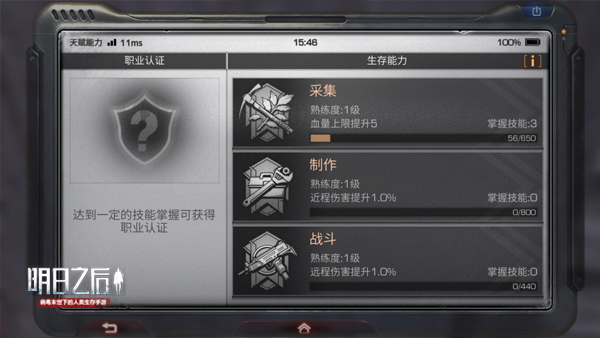 在末日中,营地欢迎不同分工互相配合。采集、制作、战斗是最重要的三大天赋技能,通过不断累积熟练度,学习更高阶的天赋技能,成为一名合格的末日生存者。如果达到一定程度的技能后,还能获得相应职业认证,成为一名受人尊敬的幸存者精英。