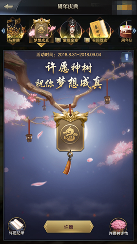 周年庆期间,各位主公们也将收获满满的福利奖品!从9月2日开始,主公们若是登陆游戏满14天,将会直接获得心仪的考验武将!还有与小伙伴交换字牌活动,携手集字牌换取周年庆限定主城装扮等丰厚好礼!更有许愿树全服空降,许愿树培养的等级越高,你的愿望实现的机会越大。无论你是想要橙将、资源、还是高级宝物宝箱,只要齐心协力培养许愿树,都将有机会美梦成真!还有召回战友领丰厚奖励,集贤府寻访名将概率UP等等多重福利,让主公们得偿所愿,嗨翻整个周年庆!