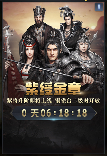 为了避免朝中某些大臣能力过强导致权力失衡,天子决定密派美人去寻找紫魂,让紫将经过重重考验之后能够成长为一名橙将,是为紫绶金章。本次周年庆中最重要的新玩法——紫将升橙,便是由此而来。紫将升橙经历七个阶段,每个阶段消耗一定数量的紫魂与兵法、战策、忠诚度等其他道具,获得相应的能力上限提升。七星汇聚之时,紫将升橙之日。武将的基础最高五维属性与紫魂的五维属性一一对应。紫将升橙所需的紫魂可以通过派遣美人到黄金台秘访或后续相关活动获得。各位主公麾下颇具实力的紫将们将能借此获得史诗级加强,实力堪比甚至超越现有橙将,协助主公大展宏图!