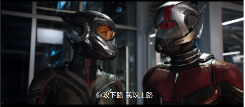 在电影预告片中出现了这样一个镜头,蚁人与黄蜂女一起对抗幽灵,蚁人对黄蜂女说:“你攻下路我攻上路。“