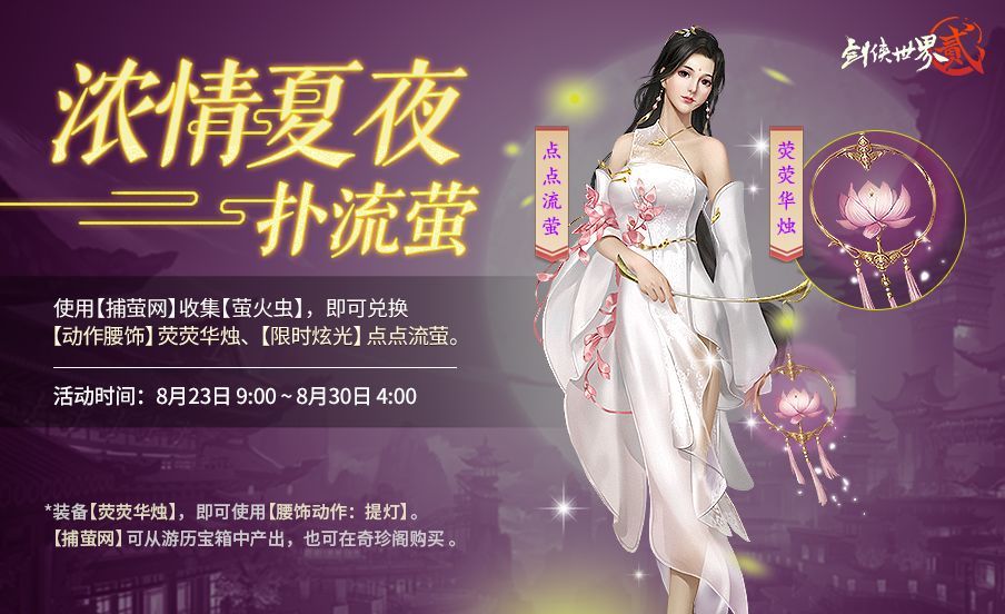 各位侠士可以前往捕萤人NPC【映雪】处参与捕萤,换取惊喜奖励!更有全新动作腰饰【荧荧华烛】、限时炫光【点点流萤】待君领取!