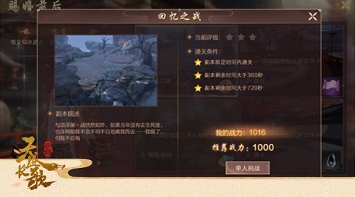 选择宁弈视角的玩家,在游戏初始就会展开“回忆之战”剧情——因捐锦赈灾有功,宁弈甫出宗正寺,前往承明殿接受封赏。下朝后,于朱雀大街路过一位说书人,他讲起了十八年前的往事,直接导致大成后裔被杀,前朝灭亡的生死崖一战……