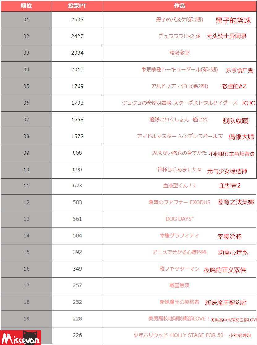 《暗杀教室》排第三,原作漫画人气非常高,剧情不用说,设定上就已经决定了这部作品是有趣的。嗯,实在想不出别的词,只能用有趣来形容了。加上前阶段声优列表的公布,福山润什么的就不用多说了。总之小编窝也是非常期待的。