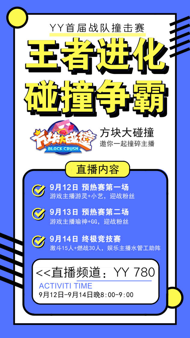 《方块大碰撞》首次携手YY LIVE游戏频道780,联合举办“王者进化,碰撞争霸——YY首届战队撞击赛”,赛事将于9月12日-9月14日每晚8:00-9:00连续三晚在YY 780频道盛情开播,届时将邀请四大人气游戏主播,更有资深YY娱乐主播水管工倾情加盟。