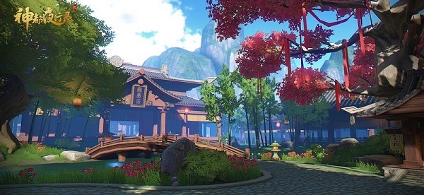 再从庭院等微观处看去,充满沧桑感的古树穿过院墙而出,而随风飘落的树叶静悄悄的悬浮在小河的水面上中,充满了中国古诗画的超然意境。