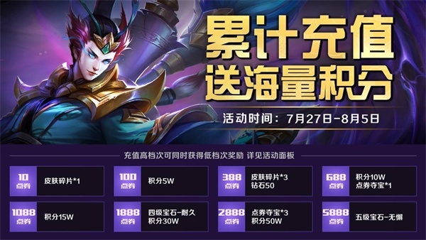 7月27日-8月5日,累计充值送好礼,海量积分等你来!