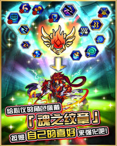 全新魂气系统解锁,给心仪的角色佩戴【魂之纹章】提升战力!玩家可以在怪物弹珠中的火、水、木、光、暗每一个属性各选一位心仪的角色佩戴【魂之纹章】,佩戴【魂之纹章】的角色通过镶嵌魂力神装,提高各种属性耐性和攻击提升等BUFF,面对不同的战场选择适合纹章和角色将大大提升部队战力!