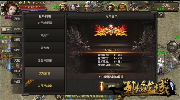 行走玛法,让人高不可攀的战力固然是震慑全场的硬指标,而一身华丽的时装更是装点门面的无上利器!此次新版推出全新雕龙城主时装,鎏金神铠现君威,霸气龙首肩上扛,奢华无二,彰显尊贵城主地位!更有“龙城首富”等顶级称号等你收集!
