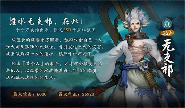 在《神都夜行录》的背景故事中,无支祁拥有一身健硕的肌肉以及高大的体型,是让众多女性降妖师心花怒放的妖灵之一。而实际上,其本身曾是祸害一方的恶神,拥有无与伦比的力量,最后被镇压于淮河之下。但是在“某人”的指点下,无支祁逐渐学会如何接受自己以及他人,弃恶从善,利用自己强大的水能力去挽救中土神州的妖灵和人类,维护社会的和平与秩序。