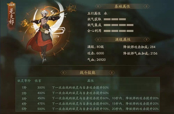 无支祁的战斗技能使他的表现非常出色。当无支祁技能释放后,下一次出战的妖灵与自身的攻击都将提升50%,且在无支祁3阶之后,还会提升降妖师20%的攻击,阶级越高,持续时间越长。并且,无支祁妖气集成的速度属于偏快类型的,所以往往在开场不久后就可以释放大招,对于整个阵容战斗力的提升大有帮助。