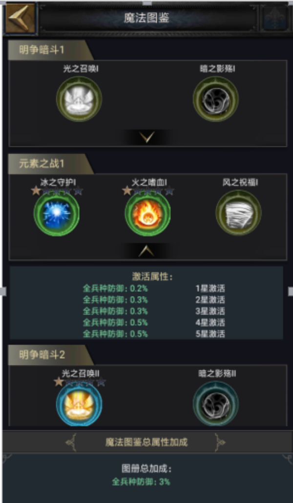 不同的组合,魔法技能星级越高,获得的属性越多,并且所有魔法组合的图鉴属性是可以叠