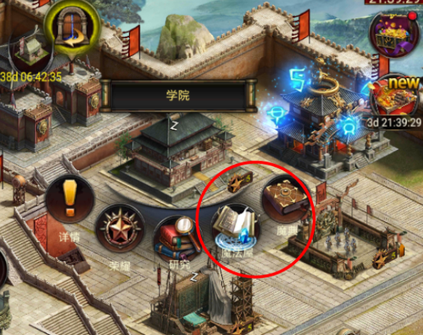 魔法学院的入口位于学院建筑,其中“魔法屋”用于召唤获取所有魔法相关的材料,玩家可以进入“魔典”,对魔法技能进行激活,升级,升星,佩戴等操作。