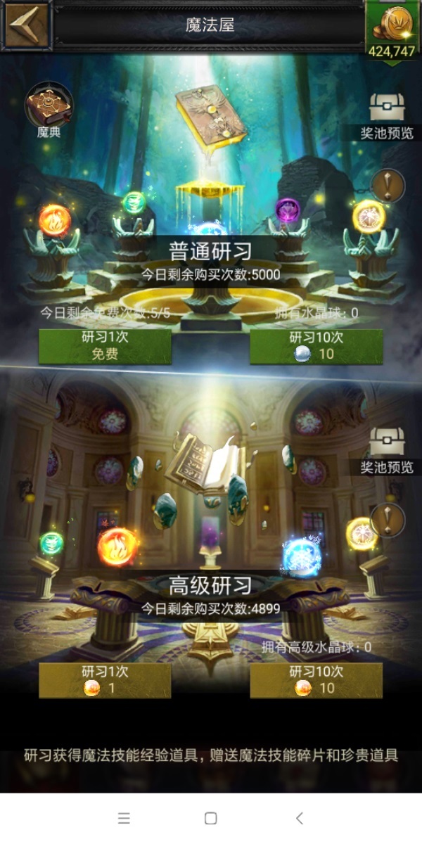 魔法屋每天都可以领取免费抽取次数。(5次低级免费,1次高级免费),也可以通过金币购买水晶/高级水晶抽取。