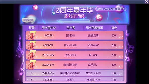 本期舞团大赛的比赛日分别是10月30日、11月1日和11月3日,每晚20:30~22:00举行,排行榜分为“动感积分榜”、“动感排名榜”、“传统积分榜”、“传统排名榜”四个榜。积分榜需要每一位玩家大显身手,展现个人风采;排名榜则需要舞团成员齐心协力,完成出色的团队协作。无论哪一种模式,都可以让我们提高舞技,增长友谊。