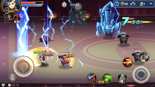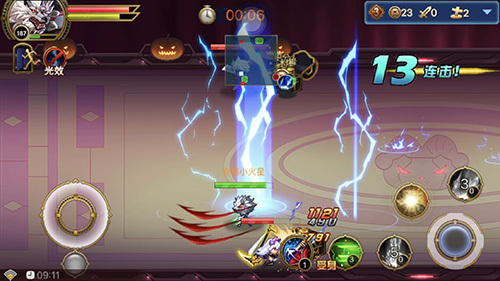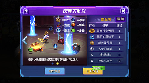 在战斗开始后,场中会不时出现黑色小恶魔,和红色小恶魔,击杀两种小恶魔可获得积分;另外会出现宝箱,宝箱中包含积分道具,拾取后获得少量积分;也含有药瓶,可以补充血量;还有通用技能——通用技能有使用次数,消耗完后就必须捡宝箱补给。