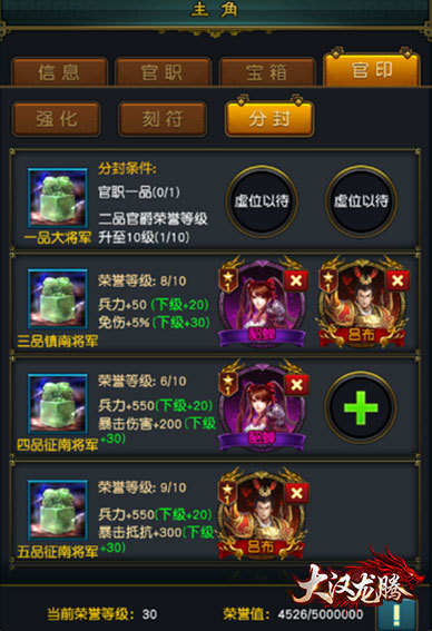 1.官职八品后,荣誉达到规定条件后,可对武将进行爵位分封