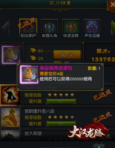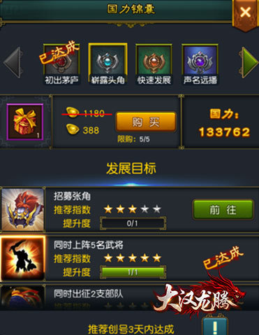 国力锦囊中分为“初出茅庐”、“崭露头角”、“快速发展”、“声名远播”、“争霸天下”、“三国无双”几个章节,分别代表了玩家在游戏中发展的不同阶段。而每个阶段都会为玩家列出此阶段中的发展目标,让玩家在发展过程中不会迷茫、不知所措。