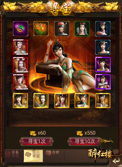 寻宝包括装备寻宝和美人寻宝,玩家可花费一定数量的元宝来寻获珍稀装备和美人碎片。