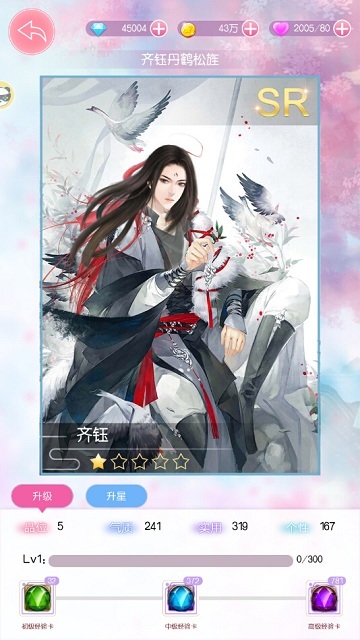 再次是齐钰。齐钰作为无口、无心、无表情的“三无”美男子,立绘风格比较统一,就是典型的高冷风格,颜色以冷色为主,画面布局复杂巧妙。此外,齐钰也有不少暖色的立绘,“丹鹤松旌”就是典型,画面中齐钰姿态休闲,周围用飞鸟点缀,各种颜色分配恰当,既显得温暖柔和又不显得过于活泼热情。