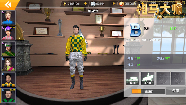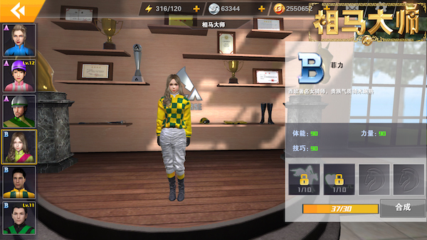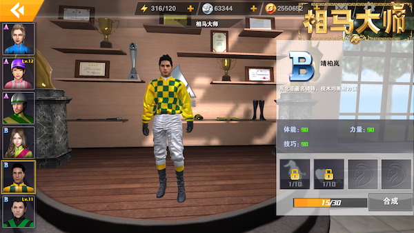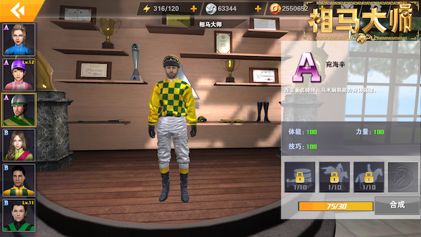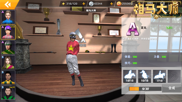 现实中,赛马比拼的不仅仅是马儿能力,骑师的策骑技巧也是非常重要的,一名优秀的骑师可以帮助马儿在比赛中激发自己的潜能,发挥出120%的能力。在《相马大师》中,共有6位来自世界各地的骑师可供选择,与现实情况一样,在游戏中骑师也发挥着重要的作用。