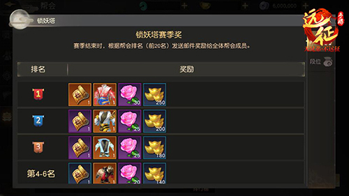 这场全新的跨服盛宴,全服帮会的匹配参与当然不是玩法的全部,在BOSS奖励之外,真正让所有玩家疯狂的奖励,是藉由赛季段位来产生。各帮会通过参与“锁妖塔”根据成绩获取荣耀积分晋升段位,每个自然月为1赛季,段位分为青铜、白银、黄金、铂金、王者,五个阶别,在赛季结束后,根据帮会所在段位,帮会全体成员均可获得对应奖励。