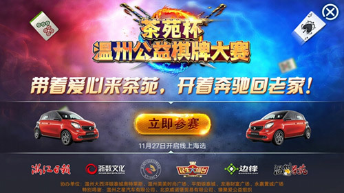 总冠军价值十万的奔驰smart汽车5年使用权,奖品总额高达50万元!11月27日,“茶苑杯”温州公益棋牌赛4个赛区(温州市区、永嘉、平阳、苍南)全面启动。