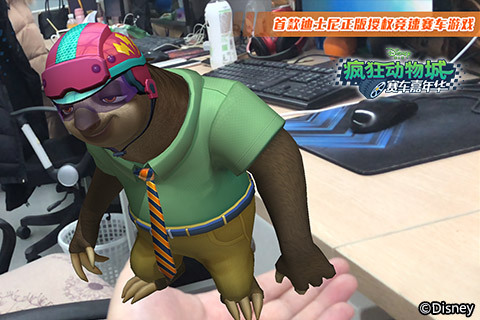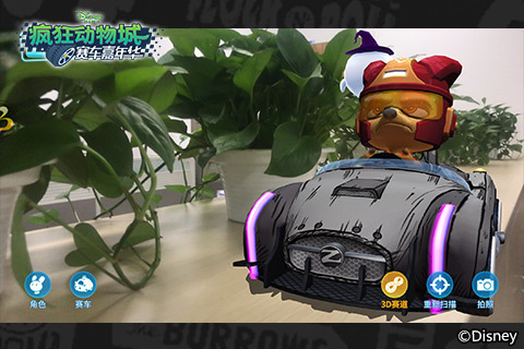 iPhone7以上机型的iOS用户在主界面点击AR按钮进入,在AR世界里,疯狂动物城的动物明星们通过手机摄像头“穿越”到了三次元世界。《疯狂动物城:赛车嘉年华》不但可以让你感受360°沉浸式游戏体验,也能让你在办公桌上开始飘移训练。