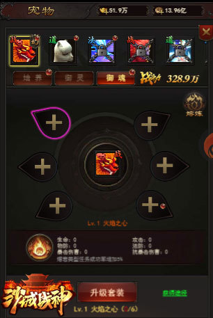 在御魂页面,如果能集齐生命、攻击、物防、法防、暴击及抗暴六种属性的升级道具,即可一键升级套装,获得更高的属性加成。