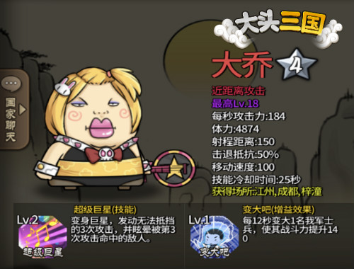 不过......再看《大头三国》里的大乔,想必各位玩家见到她的第一眼也是惊掉了下巴,这身姿,妥妥把一头身的恶搞精髓演绎到了极致。好在其技能【超级巨星】放在战场上还算可攻可控用着顺手,名为【变大吧】的增益效果更是赤裸裸地提升我军战力。但小编还是要吐槽,这沉鱼落雁说的原来是这个“沉”!!!