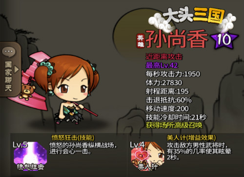 不过《大头三国》里的孙尚香可没有被诸葛亮阴了那一手,更没有与刘备假戏真做,便宜了这个糟老头子。在新版本中孙尚香不仅一举晋升10星,封号英雄孙尚香,环顾一圈其她女性角色后更是发现她竟如此得宠成为第一名荣升10星的女性英雄角色。原本【寒冰冷箭】技能就已经还原历史上炉火纯青的射术,现在更是用一招【愤怒狂击】技能纵横沙场,完美还原了刚才提到的“身边侍婢百余人,皆亲自执刀侍立”的英姿。
