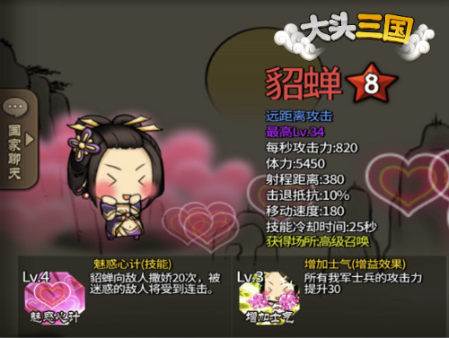 除了美貌冠绝整个《大头三国》,手游里貂蝉的胆识与担当也同样不输演义中的形象。古有王允设连环计并授义女貂蝉施行,最终借钢铁直男吕布之手除掉董卓;大头的世界中也有貂蝉使一招【魅惑心计】将爱洒满沙场,诱得敌军晕头转向。想来也是,有这千古第一美人掠阵,前方的将士们一定会如打了鸡血般冲锋陷阵。