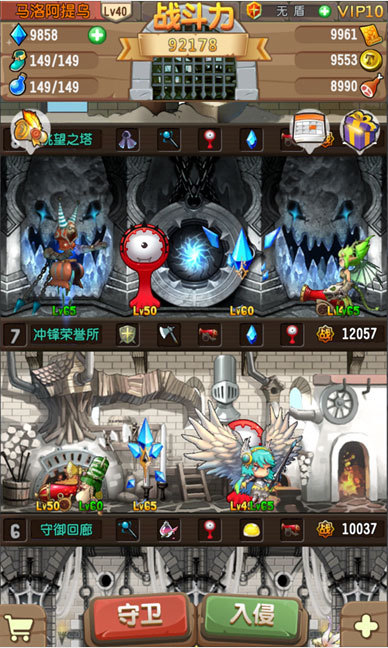 《塔防骑士团》中不仅有经典的守卫玩法,更新增了入侵、闯关、复仇等多种玩法。类COC式的入侵玩法让玩家的角色从防守变为攻击,主动出击“强拆”其他玩家的塔,大量掠夺资源,被入侵的玩家则可选择复仇玩法,抢回属于自己的资源。闯关玩法则让玩家在紧迫的时间内挑战强大的怪物和复杂的关卡,完成挑战的过程着实让玩家体验了一把冒险的快感。