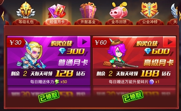 尽管我提倡少花钱、多办事,但只需要冲一点点钱就可以事半功倍,你平时忍下少干点别的,这个钱绰绰有余。游戏中超值月卡分两种,30块的和60块的,建议一起买掉,撑死90块钱。抠一点你好歹买个60的,因为万能碎片这是个好东西,麻雀变凤凰就靠它了。另外,60块刚好V3,可以买开服基金。所以最差最差买一个60的月卡。