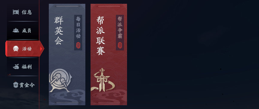 帮派内新增【活动】页面,内设【群英会】及全新【帮派联赛】, 玩家可以自行选择进入。