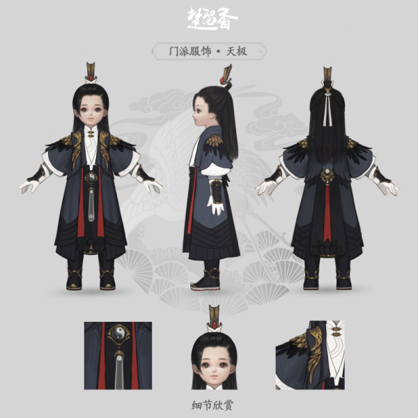 不同于师兄们的款式,小道长“天极”套装的衣襟间与后腰缀有红色带子,配色上更为活泼明朗,小改黑金主色的沉重。佩戴上镶有红珠的高束发冠,更贴近孩童的天真气质。