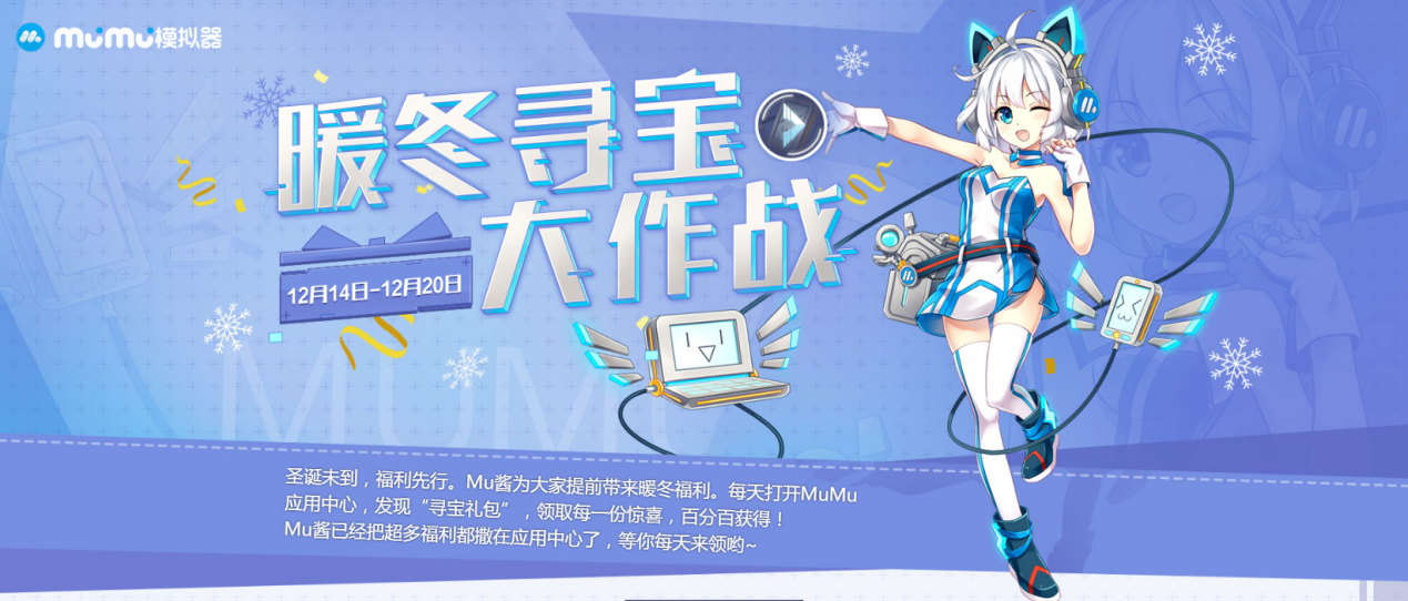 叮叮当,圣诞节即将到来了,为感谢玩家一直以来对模拟器的支持与厚爱,MuMu模拟器不仅继续为玩家提供一个体验好、玩得好的战场,还准备了圣诞重磅福利活动“暖冬大作战”馈赠玩家!iPhone X、Switch游戏机、网易云音乐会员、B站大会员、京东卡、游戏福利礼包等超值好礼,只需在MuMu模拟器应用中心搜一搜、点一点即可获取!机会难得不容错过,速速叫上亲朋好友一起参与MuMu暖冬寻宝大作战吧!活动传送门:http://mumu.163.com/ndxb/。