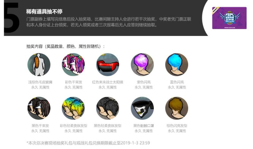 总决赛比赛间隙主持人会进行稀有大抽奖,中奖者凭门票上台领奖,奖励包括永久无属性浅棕色毛皮披肩、永久无属性彩色千束发、永久无属性红色未来战士太阳镜、永久无属性紫色闪亮、永久无属性蓝色闪亮、永久无属性黑色千束发、永久无属性彩色轻柔贵族发型、永久无属性黑色轻柔贵族发型、永久无属性黑色骷髅口罩、永久无属性棕色闪亮发型。比赛结束之后还能凭门票领取价值千元的观战大礼包,机会难得不容错过!