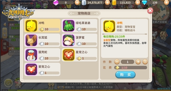 想要获得萌宠冲鸭,首先要通过宠物扭蛋获取异域金绒,而后就可以使用异域金绒在宠物商店兑换冲鸭。