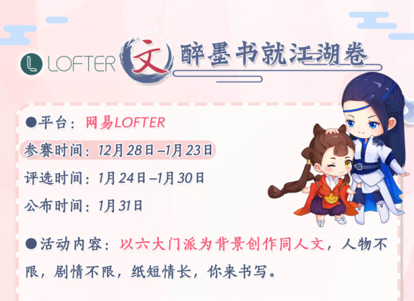 登陆“网易LOFTER”,搜索“楚留香贺岁”进入活动页面即可参赛,更有同人专属挂件“云追月”、限定称谓“醉墨书就江湖卷”、Kindle等大礼等你来拿。活动参赛时间为12月28日至1月23日,且于1月31日当天公布获奖名单。