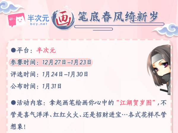 登陆“半次元”,搜索“楚留香贺岁”进入活动页面即可参赛,活动参赛时间为12月27日至1月23日。将于1月24日至1月30日期间进行评选,并于1月31日当天公布获奖名单。