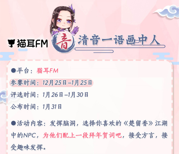 登陆“猫耳FM”,搜索“楚留香贺岁”进入活动页面。活动投稿时间为12月25日至1月25日,评选结果将于1月31日公布。