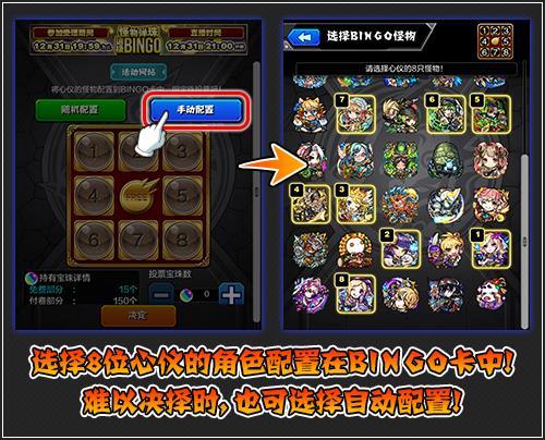 “怪物弹珠运极BINGO”会在2018年12月27日(周四)16:00开放游戏内参与通道。作为参与游戏必备道具的BINGO卡会在2018年12月27日(周四)16:00~12月31日(周一)20:00时间内开启。玩家需在活动期间内选择自己心仪的游戏角色填满BINGO格,并且押注宝珠。