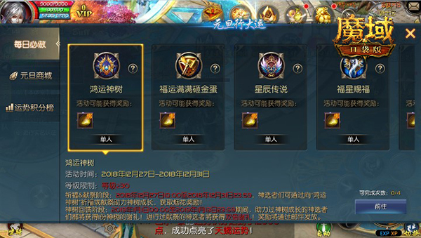 新年到来,必将财富好运双丰收!即日起至2019年1月13日,《魔域口袋版》“元旦行大运”活动好运开启,为你累积新年好运气,赢取一整年鸿运高照!在活动期间,通过参与福星赐福、星辰传说、福运满满砸金蛋、天运秘境等活动,即可获得祝福徽章,可用于在元旦祝福商店中兑换精美礼品。而活动更大的惊喜则在于运势积分的累积,参与每项活动均可获得一定的运势积分,运势积分达到一定值即可点亮星座水晶运势,兑换珍稀好礼;而每位玩家的运势积分还将累积入“运势积分榜”中,累计进入排行榜前10名的玩家将在活动结束后获得绝版称号及30星魂兽奖励,真正神运齐天、吉星高照,助力新年运势满满!