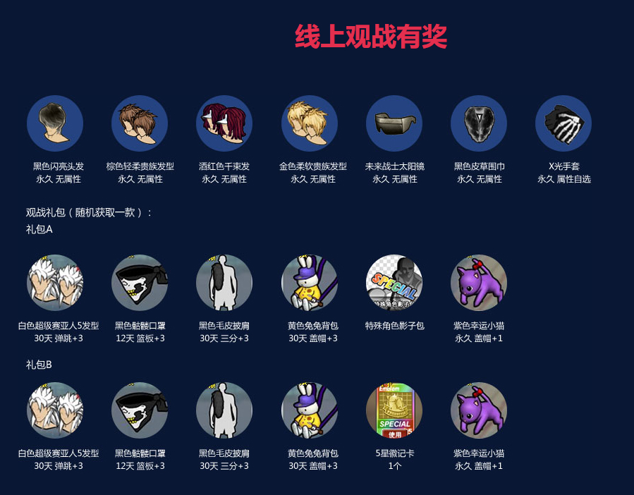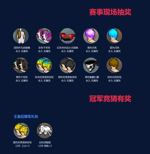 12月30日FSPL总决赛比赛间隙主持人会进行稀有大抽奖,中奖者凭门票上台领奖,奖励包括永久无属性浅棕色毛皮披肩、永久无属性彩色千束发、永久无属性红色未来战士太阳镜、永久无属性紫色闪亮、永久无属性蓝色闪亮、永久无属性黑色千束发、永久无属性彩色轻柔贵族发型、永久无属性黑色轻柔贵族发型、永久无属性黑色骷髅口罩、永久无属性棕色闪亮发型。比赛结束之后还能凭门票领取价值千元的观战大礼包,机会难得不容错过!全程观战礼包每位玩家凭门票只能领取1份,不能代领。