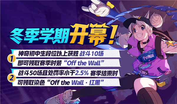 冬季联考开幕,哪吒赛季时装上线!新赛季,累计参与10场排位赛即可免费领取哪吒赛季时装·Off the Wall,累计参与50场排位赛且处罚率低于2.5%,即可在赛季结束后领取哪吒赛季时装·Off the Wall专属染色。
