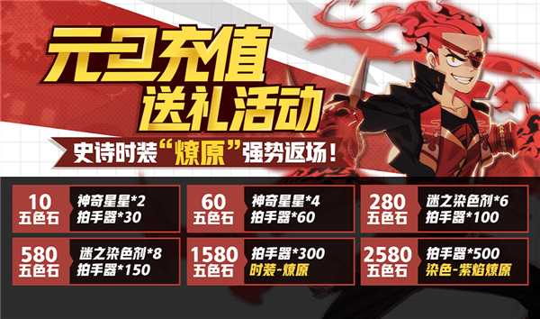 红孩儿时装“燎原”限时返场,累计充值1580即可获取!12.28(周五) 10:00 ~ 1.4 10:00,充值不同数量五色石均可获得超值奖励!